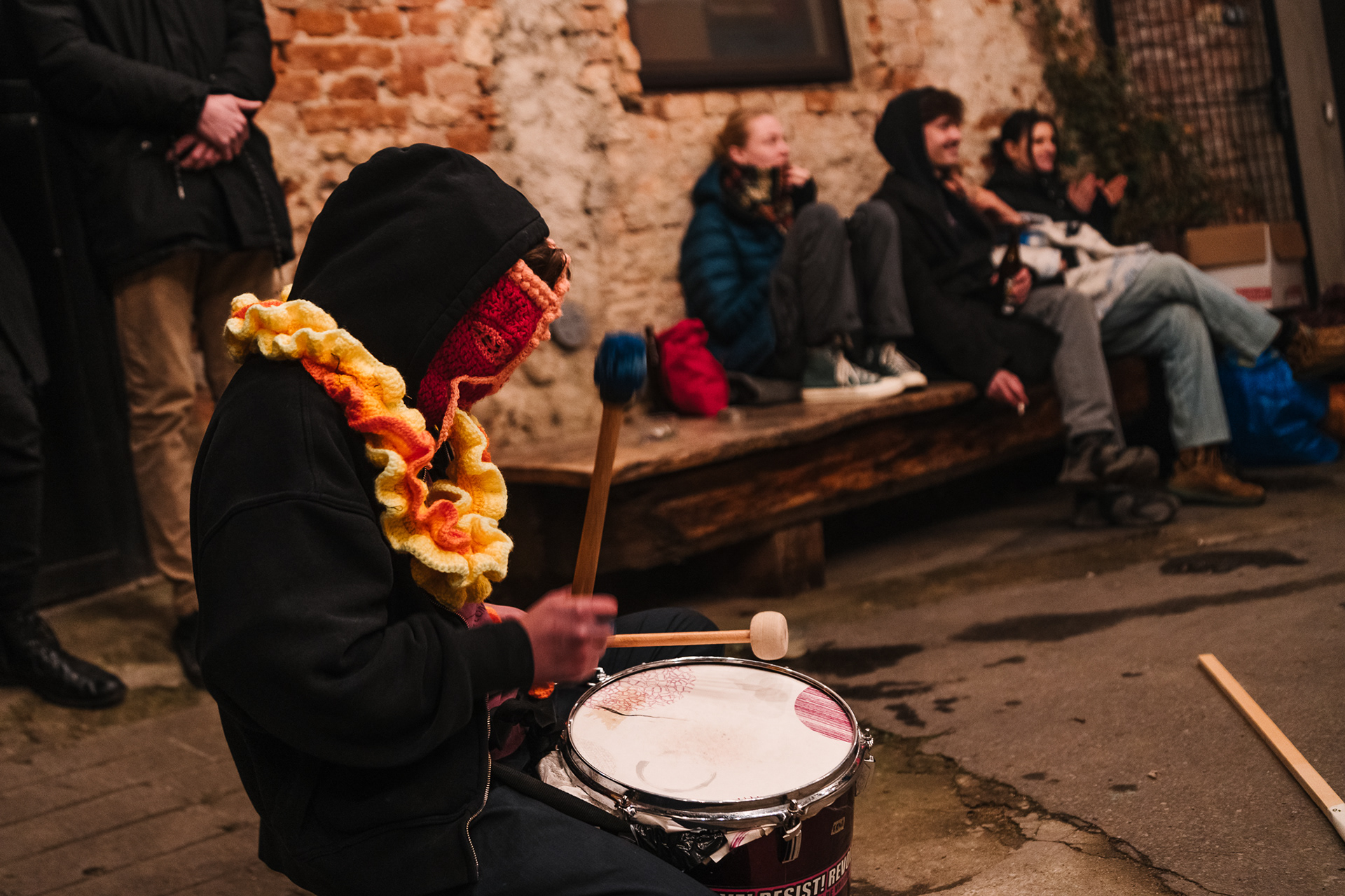 The group performance Artifa presents a unique appropriation of cheering and chanting elements, typically associated with football hooligans who use these methods to show support for their clubs. In this performative work, we used energetic chanting and rhythmic drumming to shift attention toward values that contrast with the usual dynamics of the ultras scene—most notably, the idea of an open culture accessible to all.